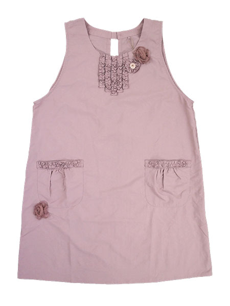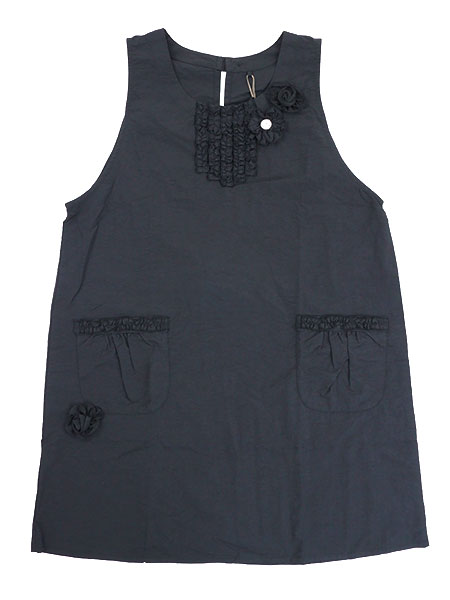 胸元と右ポケット下に花モチーフ付きで胸元中央とポケット口部分にフリル付きの可愛らしいエプロンです。
