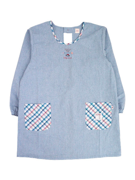 シャンブレー生地の本体に別布チェック生地がアクセントになったかわいいエプロン。