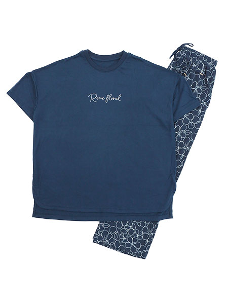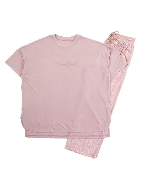 ロゴプリント入りの半袖Tシャツと花柄プリントの長パンツの夏向きルームウエア。