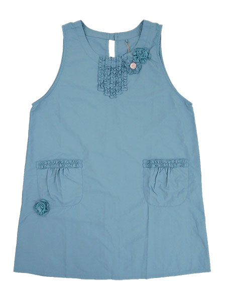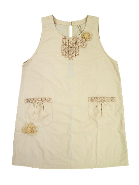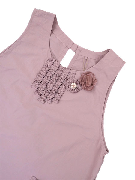 胸元と右ポケット下に花モチーフ付きで胸元中央とポケット口部分にフリル付きの可愛らしいエプロンです。