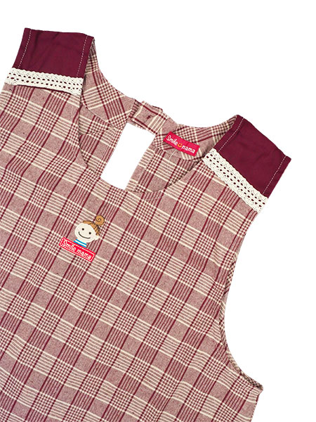 前面肩部分無地生地で切替、レース飾り付き。前左右にポケット付き。