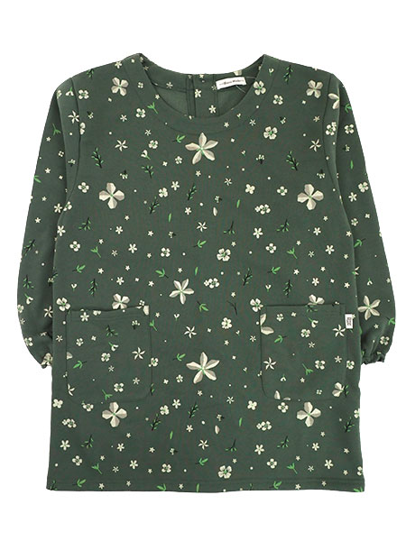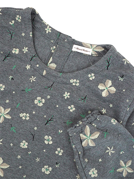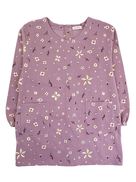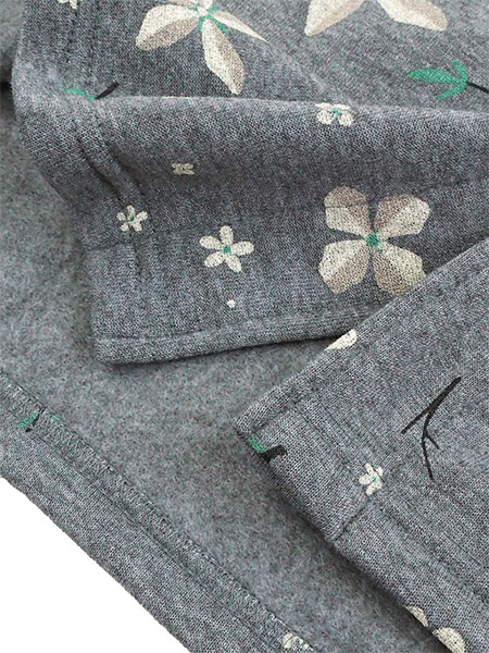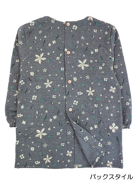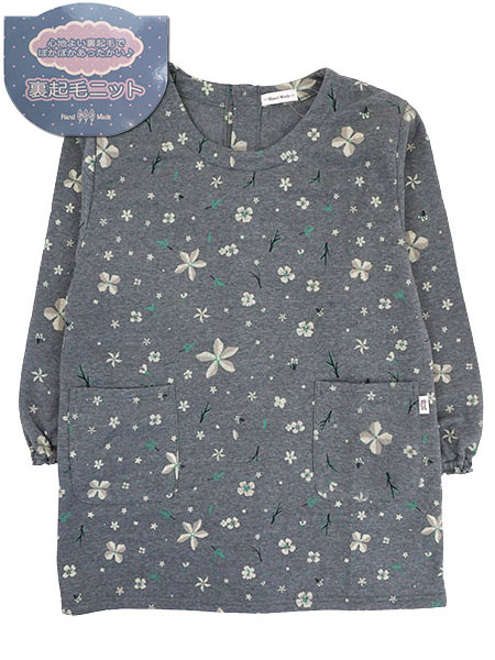 Hand Made 裏起毛ニット割烹着 背ボタン 花プリント柄