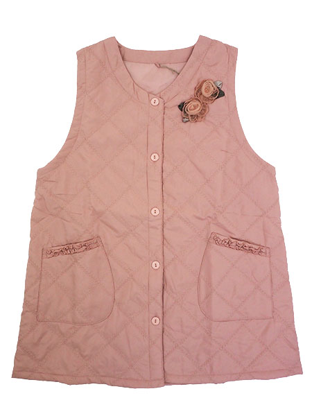 あったかベスト、5個ボタンで前あきタイプ。左胸にかわいい花のモチーフ付き。
