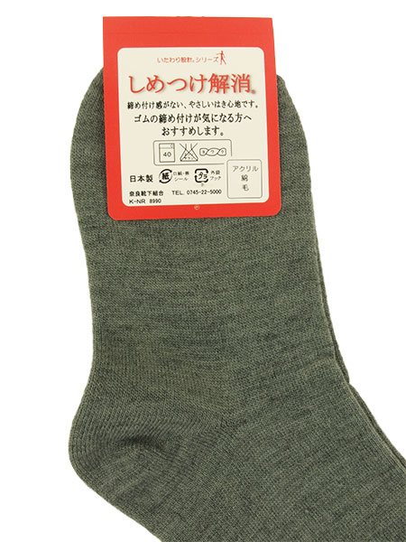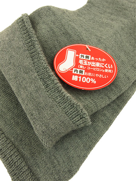 ふくらはぎを締めつけない、足にやさしい靴下です。ゴムの締め付けが気になる方へおすすめします。外側あったか毛玉ができにくい(東レコーピロン使用)、内側お肌にやさしい綿100%。日本製。
