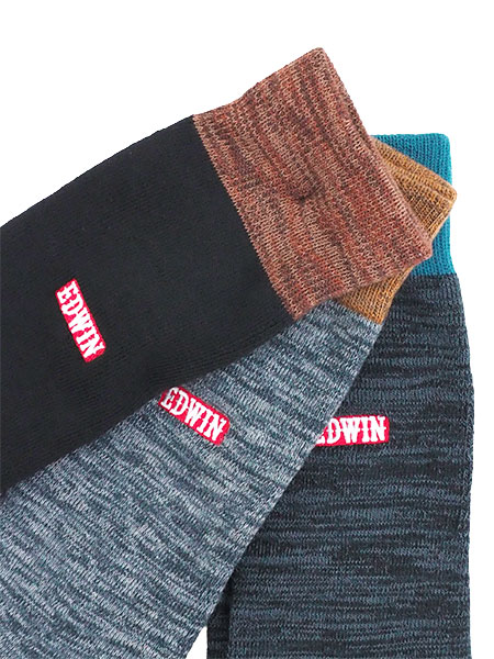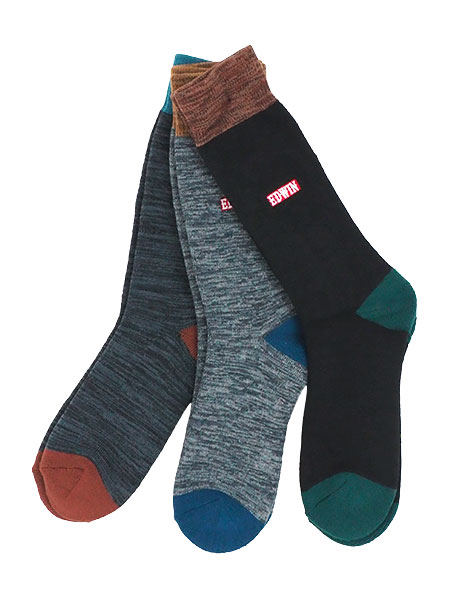 左右片側にEDWINのロゴ入り、総パイル仕様でふっくら暖かい3色セットのソックス。