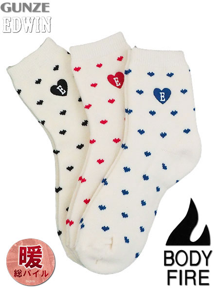 グンゼ EDWIN 婦人ソックス 3PACK ハート型 ドット BODYFIRE 総パイル