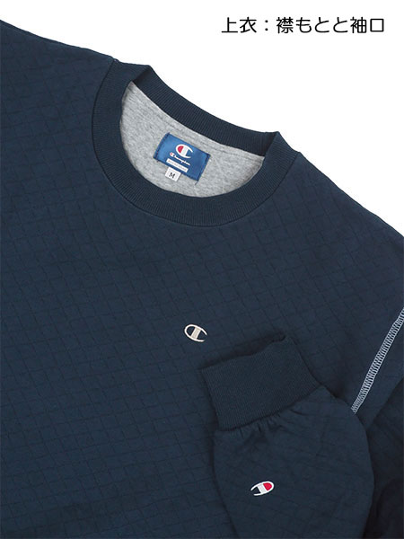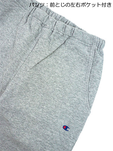 左胸、左袖口、パンツ左脇にchampionマークの刺繍入り。