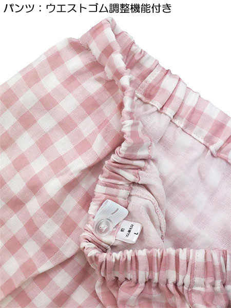 かわいいギンガムチェック柄。ウエストゴムはボタン位置を変えることで長さが調整できます。