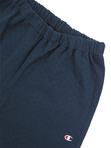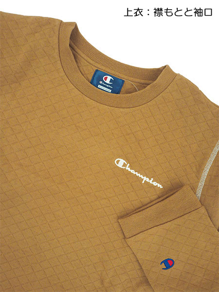 トップスの左胸にブランドロゴの刺繍、トップス左袖口とボトム左脇にチャンピオンロゴマークの刺繍入り。