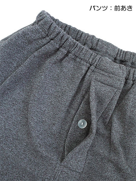 パンツ:前あき、裾リブ、ポケットなし、ウエストゴム取り替え口付き。
