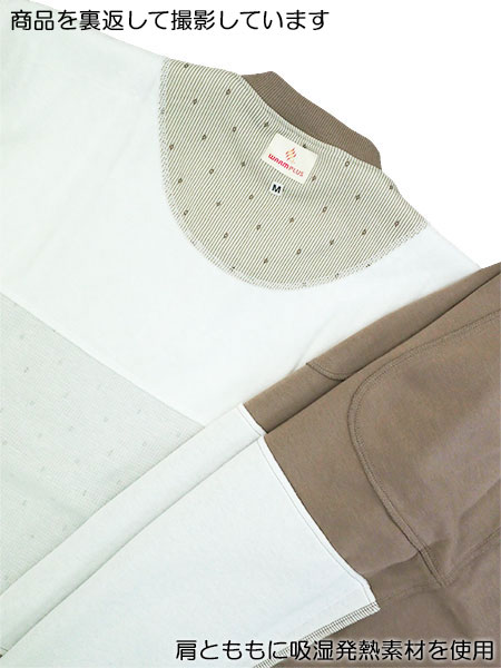 冷え対策として上衣肩とパンツ前身の重ね布に吸湿発熱素材を使用しています。