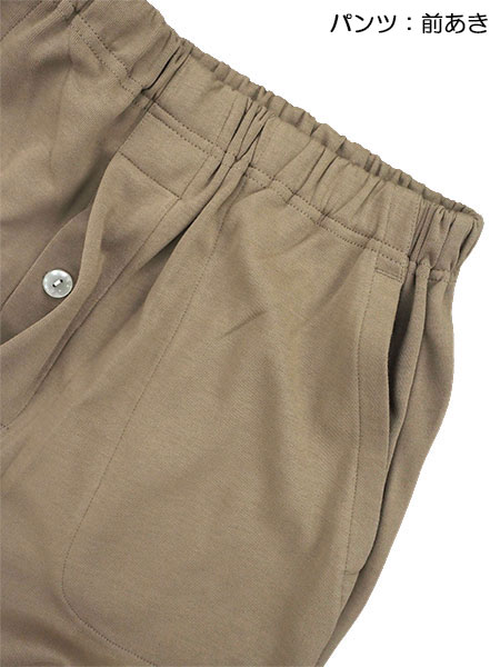 パンツ:前あき、ストレート、両サイドポケット付き、ウエストゴム取り替え口付き。