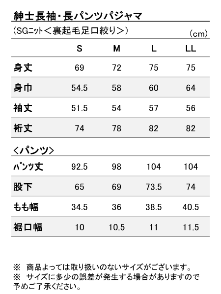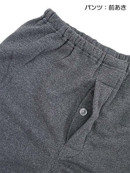 パンツ:前あき、裾リブ、ポケットなし、ウエストゴム取り替え口付き。