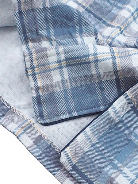 チェック柄プリント。袖口・足口ゴムにゴム通し穴付きなのでゴムを通して、ゴム絞り仕様にアレンジも可能。