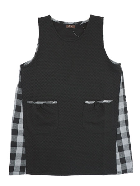 Rustica、レディースラン型チュニックエプロン、ニットとチェックのゆるカジスタイル。