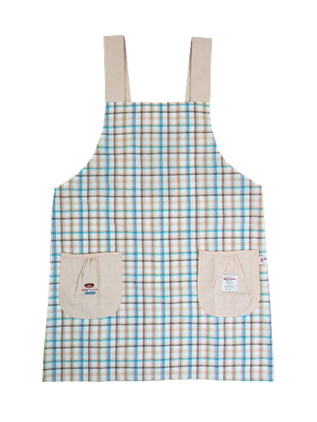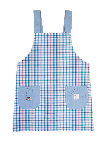 ポケット部分にビッグママのワンポイントが付いたチェック柄のかわいいエプロン。
