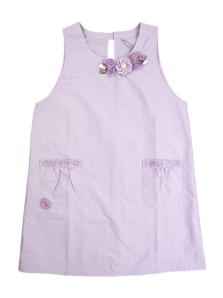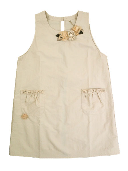 胸元と右ポケット下に花モチーフ付きでポケット口部分にフリル付きの可愛らしいエプロンです。