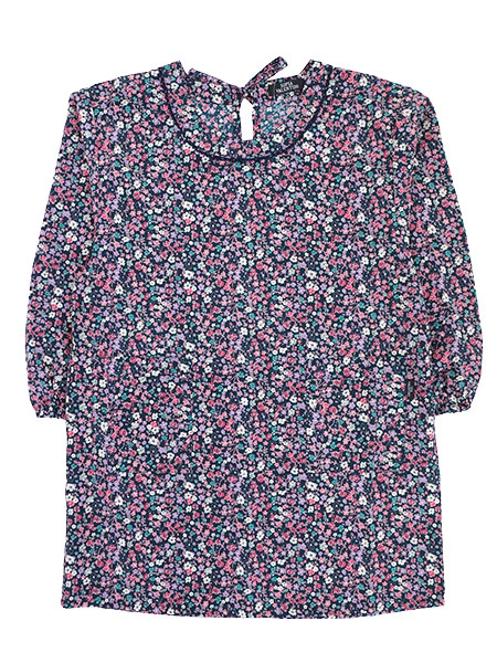 おしゃれな小花柄プリント。襟ぐりに同系色のレースの飾り付き。