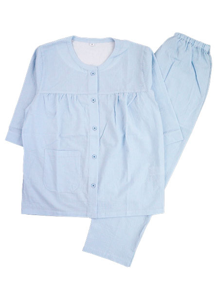 上衣:丸首、前あき、7分袖、右前ポケット付き、袖口に長さ約2.5cmのスリット入り、前身ヨーク切替ギャザーあり。