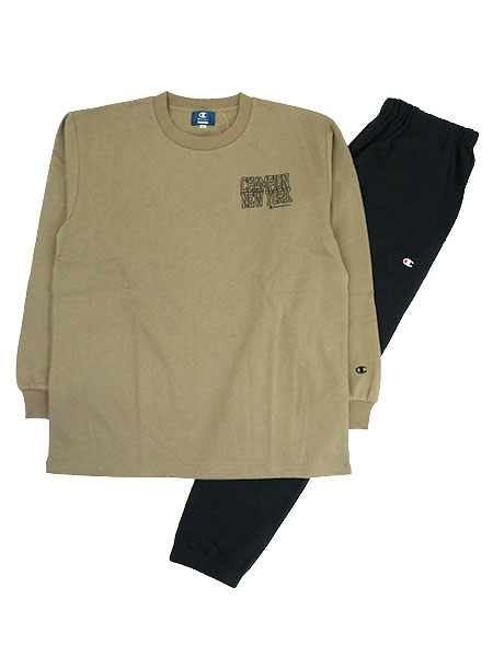 トップスの左胸にブランドロゴプリント、左袖部分とパンツの左ポケット下にチャンピオンマークの刺繍があります。