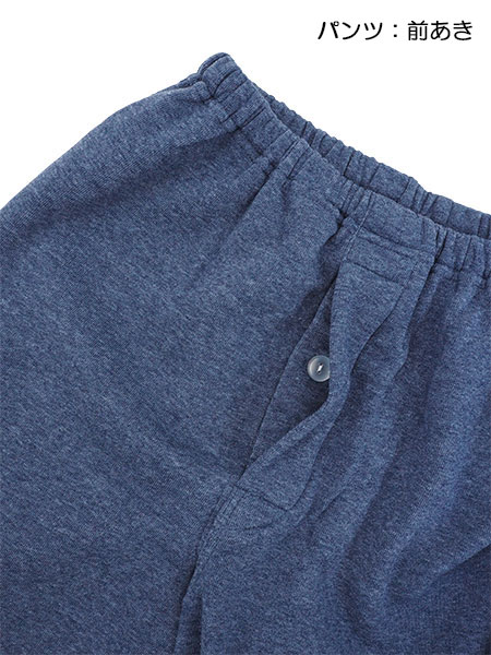 パンツ:前あき、裾リブ、ポケットなし、ウエストゴム取り替え口付き。