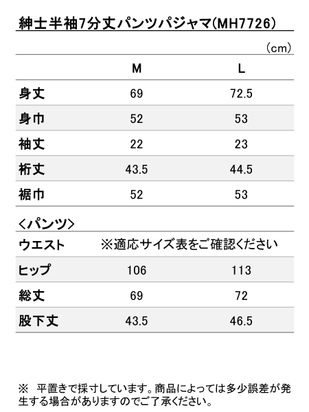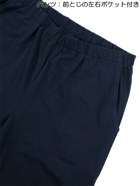 パンツ:前とじ、7分丈、両サイドにポケット付き、ウエストゴム取り替え口付き。