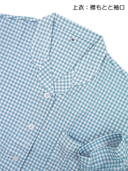 素材は風合いが良く伸縮性に優れた薄手ニット生地の天竺素材です。ギンガムチェック柄プリント。袖・足口ゴム通し穴付き。