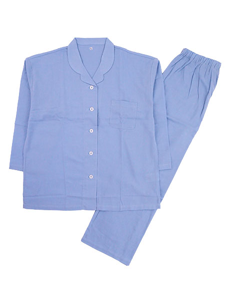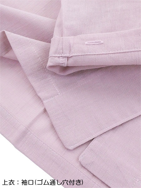 素材は暑い夏の季節に適した涼感素材のナチュラルクレープを使用。袖・足口ゴム通し穴付き。