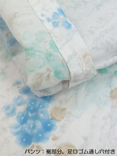 パンツ:裾ストレート、ポケットなし、ウエストゴム取り替え口付き。