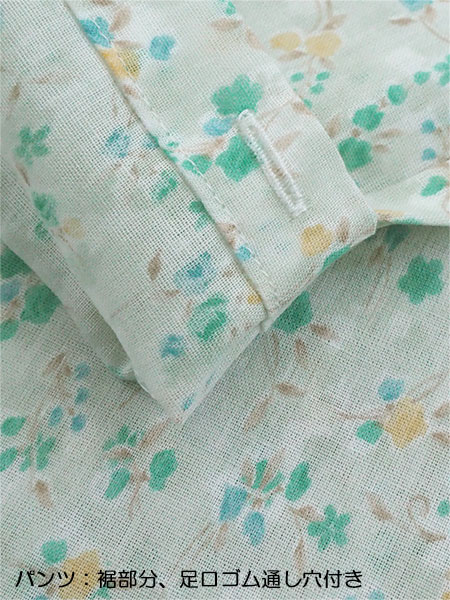 花柄プリント。袖・足口部分にゴム通し穴付き。