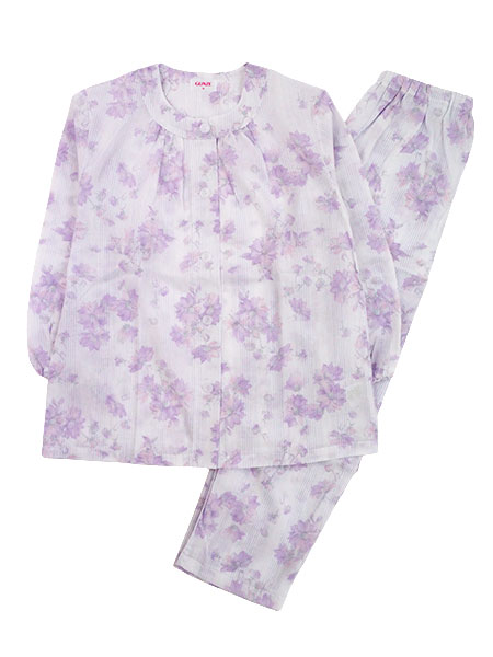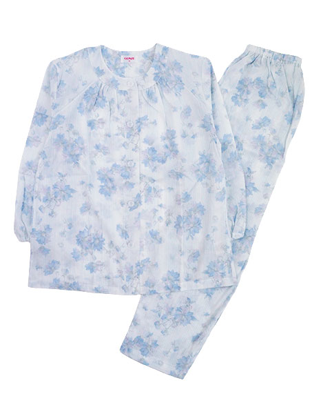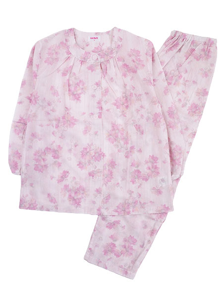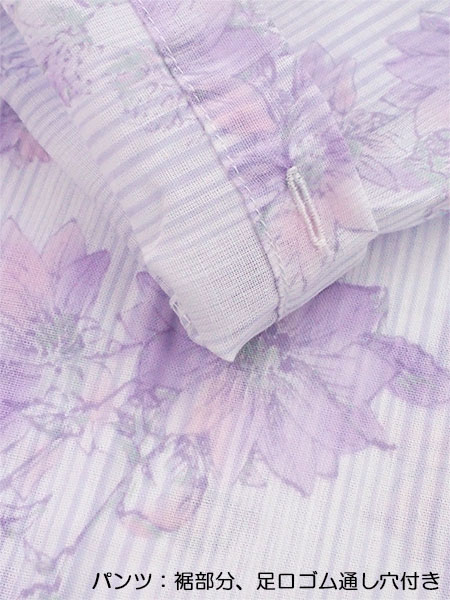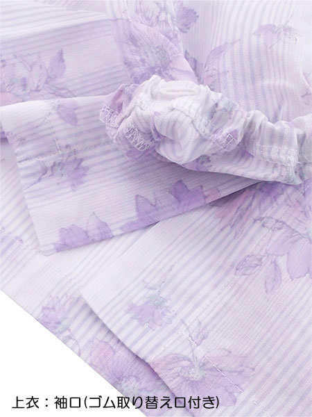 花柄プリント。袖・足口部分にゴム通し穴付き。