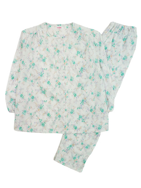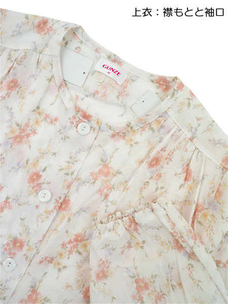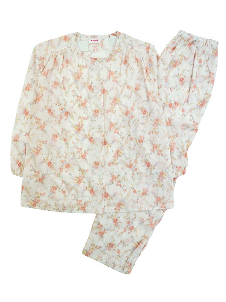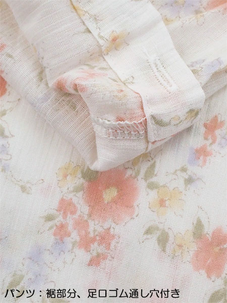 花柄プリント、袖・足口にゴム通し穴付き。
