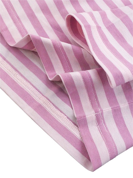 上衣:Tシャツスタイル(かぶりタイプ)、ボーダー柄、左袖山にワンポイントプリント、ポケットなし。