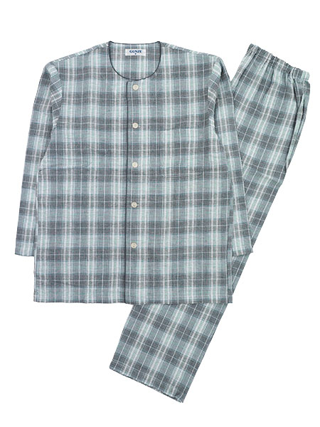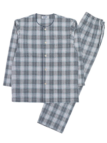 グンゼ クールマジック 紳士長袖・長パンツパジャマ 綿100%吸汗速乾 先染サッカー 襟なし
