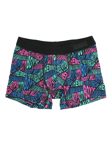 BODYWILDなどの英字が流れるように配置された粋なデザインのボクサー。
