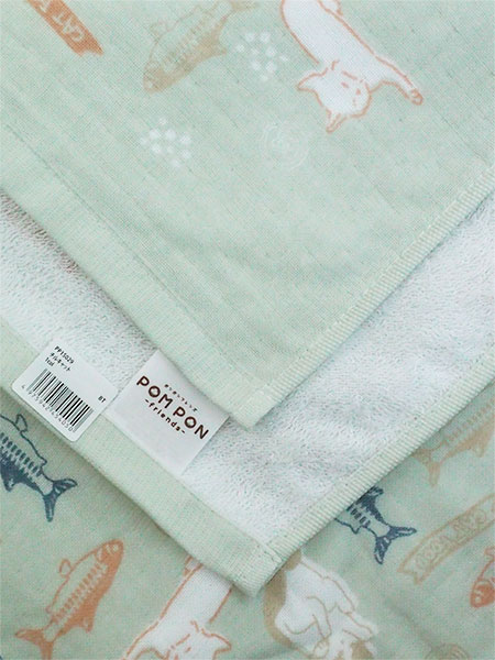 POM PON、ポンポンフレンズのバスタオル、チルキャット、プリント、表ガーゼ裏パイル。