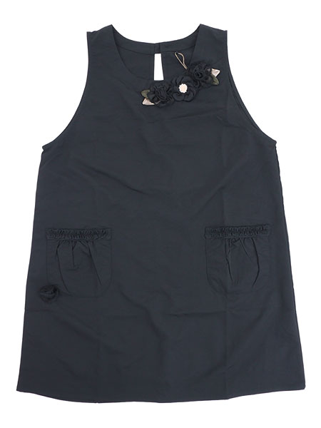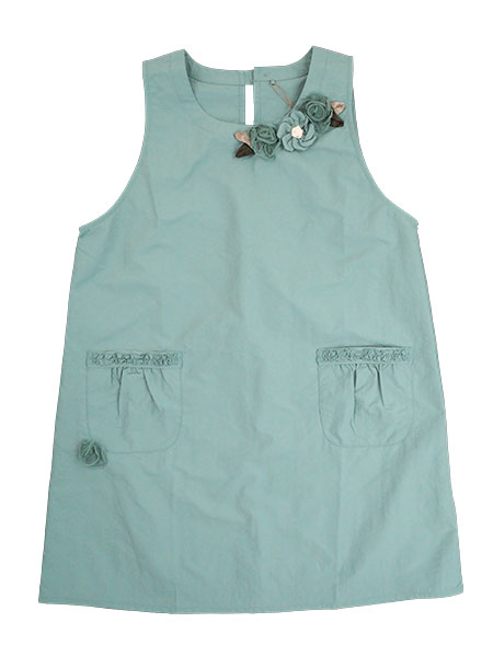 胸元と右ポケット下に花モチーフ付きでポケット口部分にフリル付きの可愛らしいエプロンです。