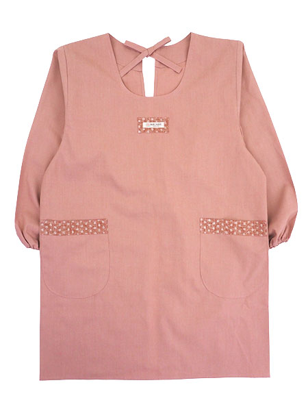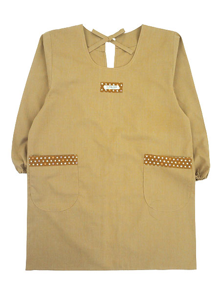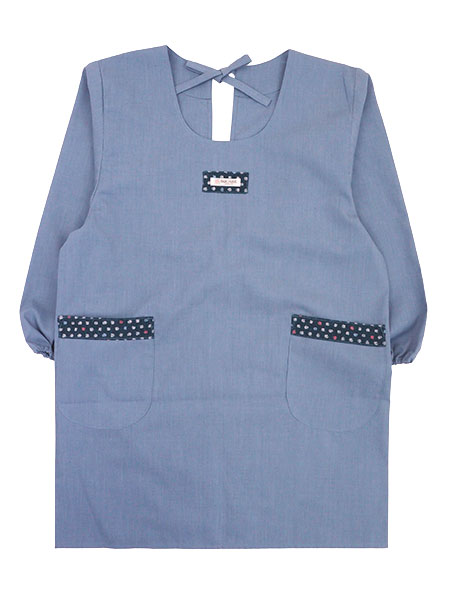 胸元とポケット口の水玉柄のアクセントがおしゃれな無地のエプロン。