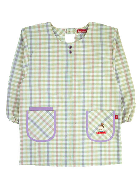 胸元に飾りボタンが2つ、左ポケット部分にスマイルママのワンポイント付きの割烹着です。