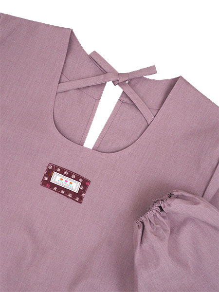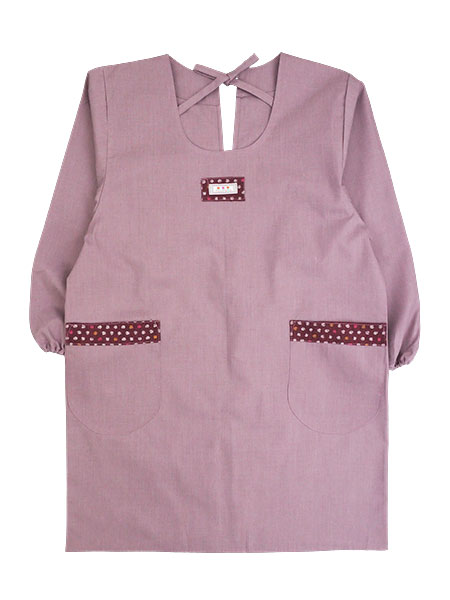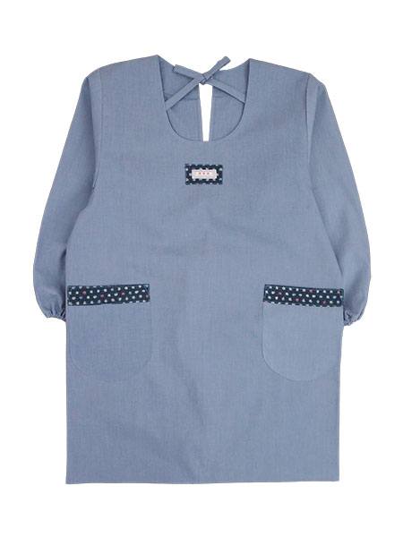 ポケットの口布と胸元のロゴ部分は水玉生地で切り替え。