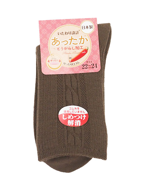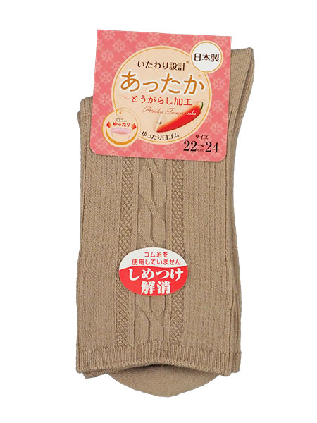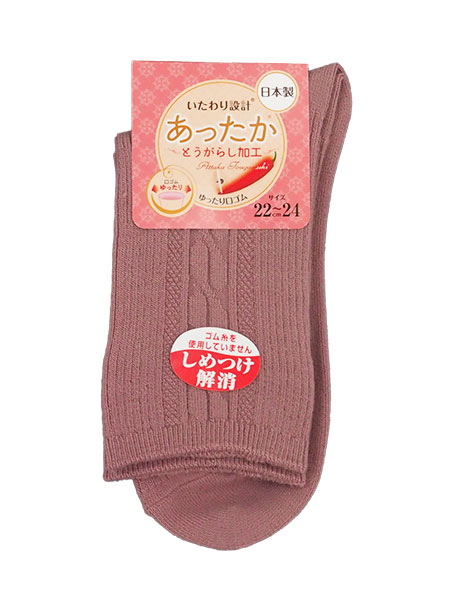 いたわり設計 あったか 婦人ソックス とうがらし加工 ケーブル柄 しめつけ解消