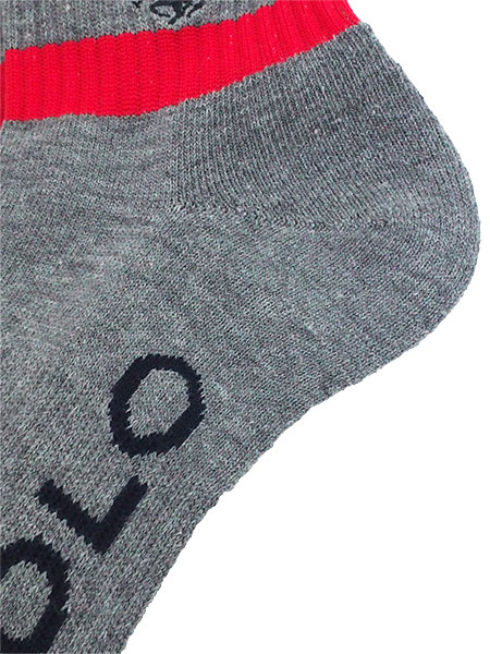 足首にアクセントカラーのライン、左右外側にワンポイントのPOLOのロゴマーク刺しゅう入り。