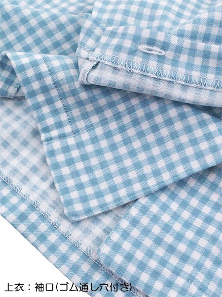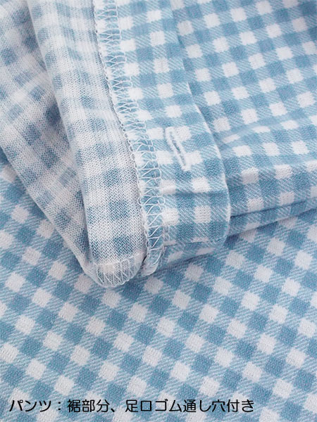 素材は風合いが良く伸縮性に優れた薄手ニット生地の天竺素材です。ギンガムチェック柄プリント。袖・足口ゴム通し穴付き。