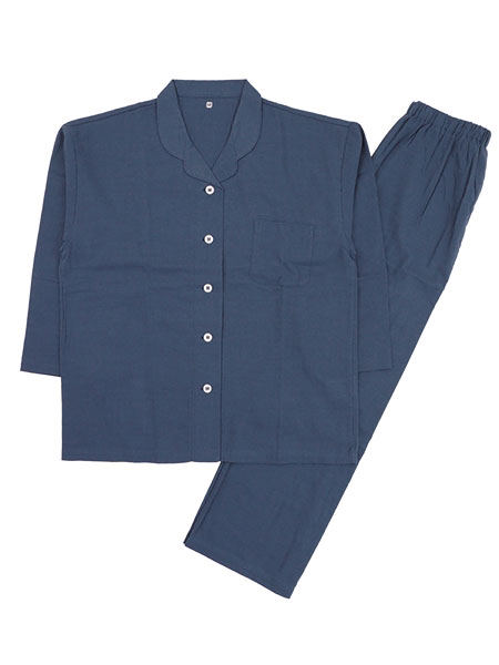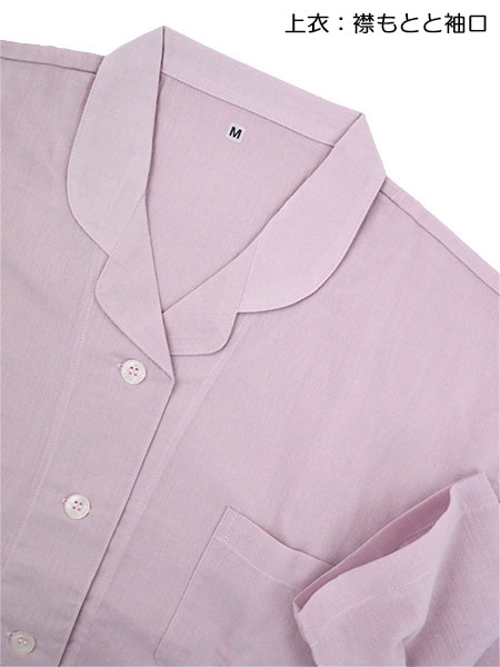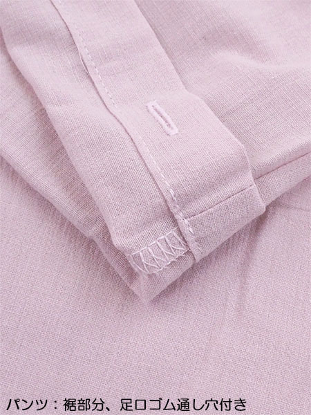 素材は暑い夏の季節に適した涼感素材のナチュラルクレープを使用。袖・足口ゴム通し穴付き。