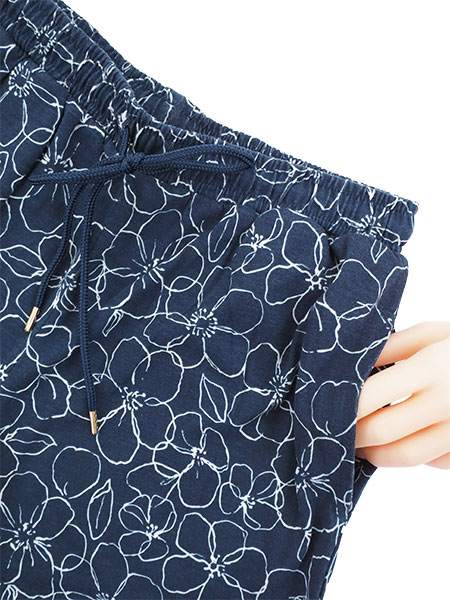 ロゴプリント入りの半袖Tシャツと花柄プリントの長パンツの夏向きルームウエア。
