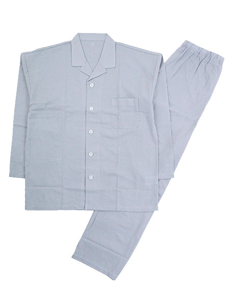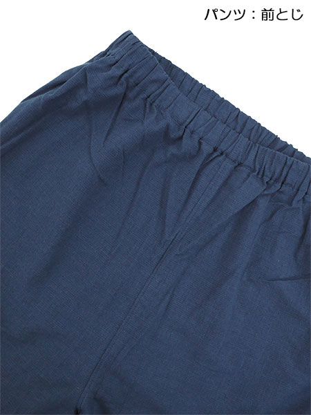 パンツ:前とじ、裾ストレート、ポケットなし、ウエストゴム取り替え口付き。