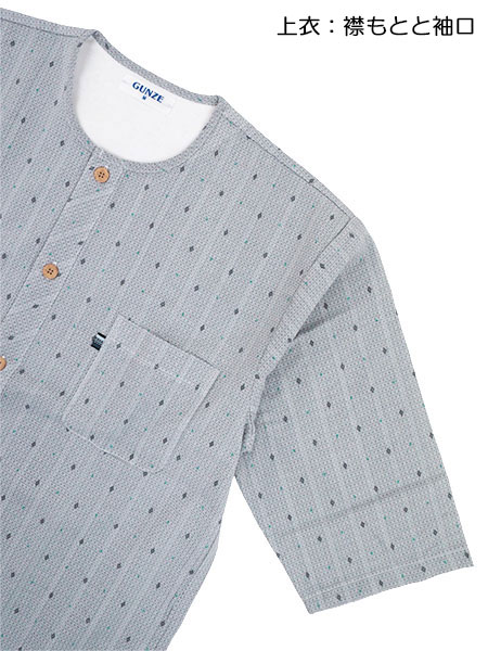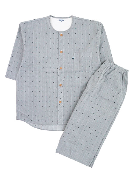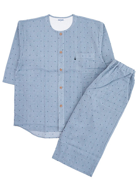 グンゼ 紳士7分袖・7分丈パンツパジャマ 寝るテコ 綿100%クレープ 小紋柄 襟なし