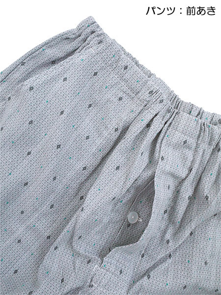 パンツ:7分丈、前あき、両サイドにポケット付き、ウエストゴム取り替え口付き。
